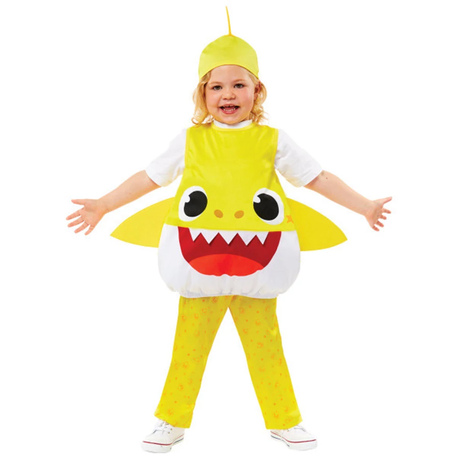 Baby Shark Yellow jelmez 3-4 évAnyaga: 100% poliészterTartalma:- ujjatlan kabát- nadrág- sapka